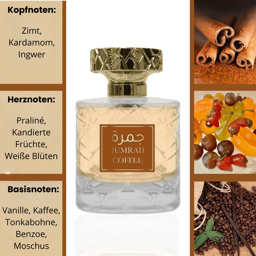 Jumrah Coffee : Une variation gourmande autour du café, mêlée de vanille, fruits confits et musc pour un sillage intense et envoûtant.