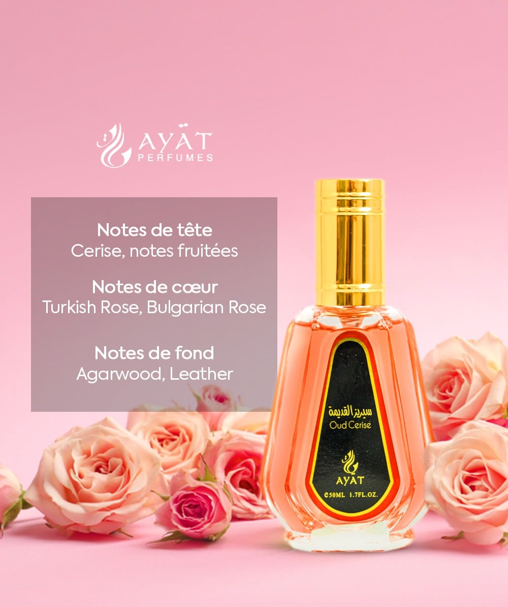 🍒 Oud Cerise : une cerise fruitée et gourmande sublimée par la richesse des roses orientales et le mystère du bois d’agar et du cuir.