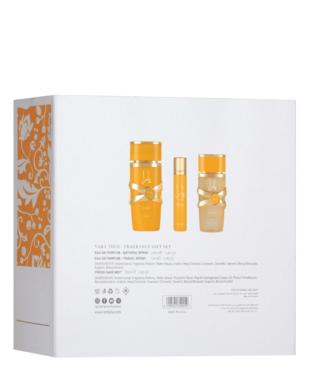 Découvrez Yara Tous, une fragrance féminine, exotique et délicatement florale issue de l’univers parfumé de Dubaï. Ce coffret complet regroupe trois formats essentiels pour profiter d’un sillage lumineux et gourmand du matin au soir.