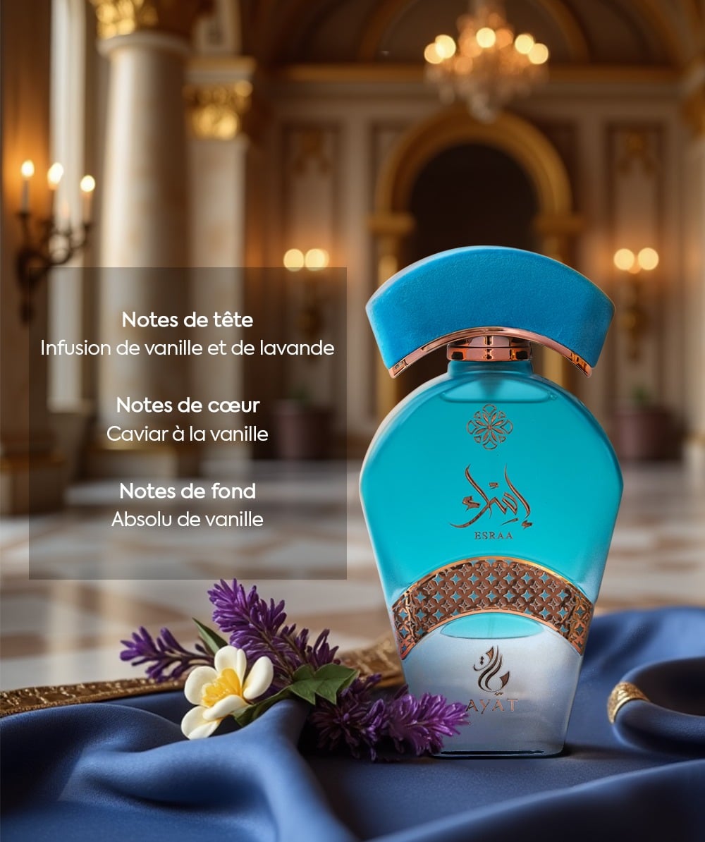 Esraa, par Ayat Perfumes, est un hommage à la vanille sous toutes ses formes. Ce parfum de Dubaï se dévoile sur une infusion lactée de vanille mêlée à de la lavande apaisante, pour une première impression douce et chaleureuse.