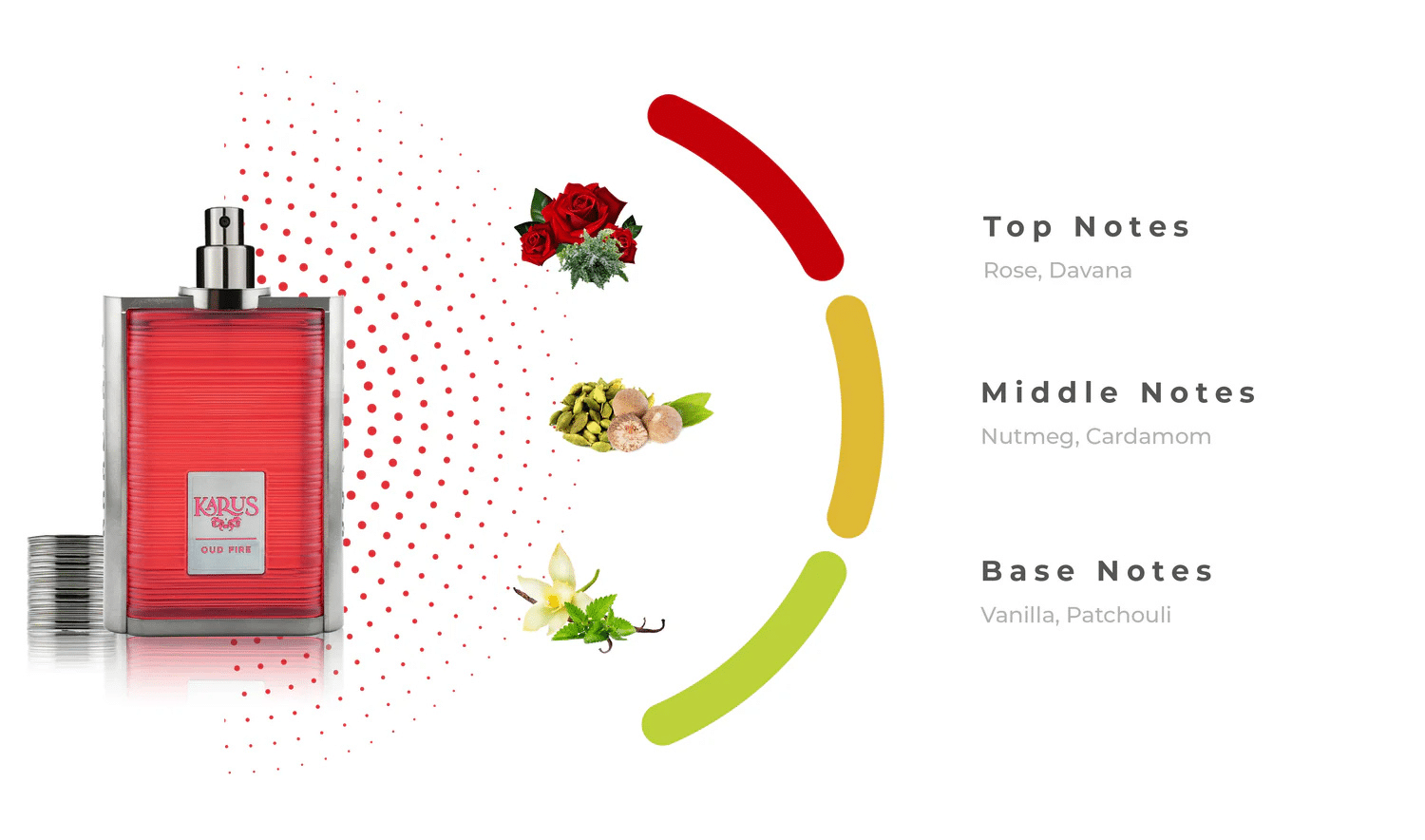Karus Oud Fire, signé Khadlaj Perfumes, est un parfum de Dubaï enivrant et mystérieux qui marie chaleur épicée et douceur orientale. L’ouverture révèle une rose veloutée associée à la davana, une plante aromatique aux reflets liquoreux et boisés.