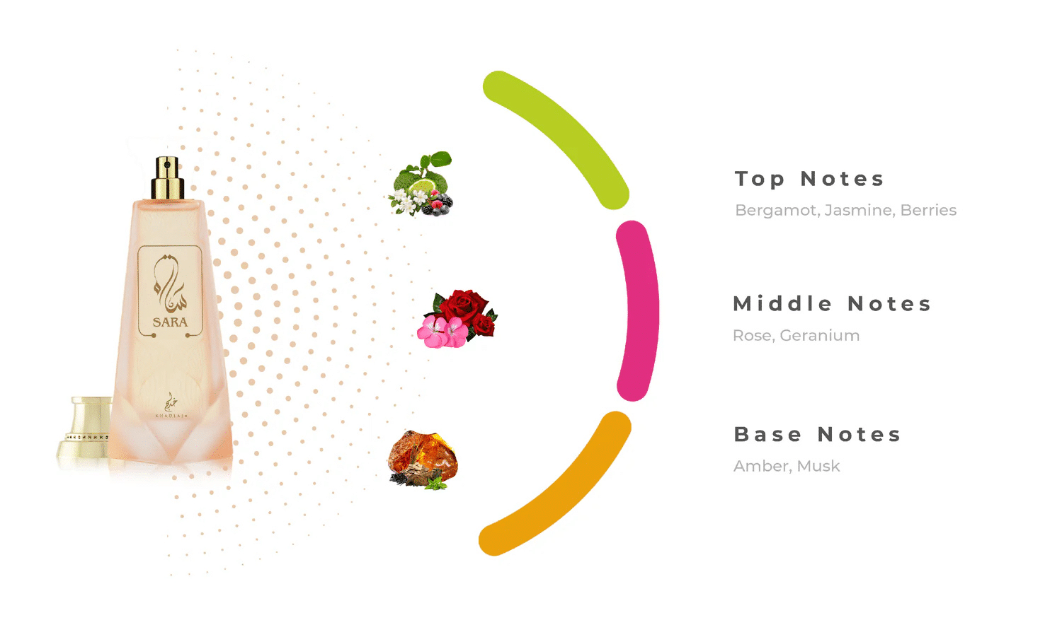 Sara, par Khadlaj Perfumes, est un parfum de Dubaï délicat et féminin qui célèbre la fraîcheur florale et la sensualité musquée. Son ouverture lumineuse mêle la bergamote pétillante, les baies rouges fruitées et le jasmin aérien, pour un départ à la fois joyeux et raffiné.