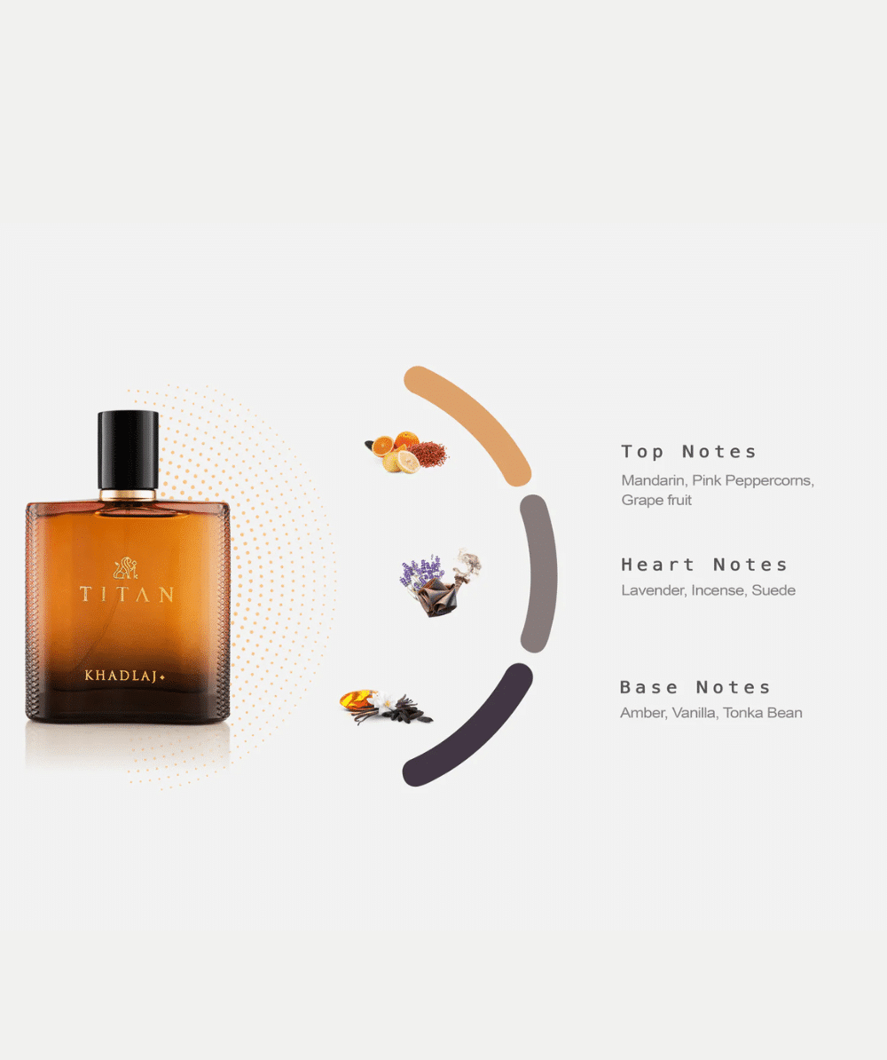 Découvrez Titan de Khadlaj Perfumes, un parfum de Dubaï pour homme à la fois frais, sensuel et charismatique. Les notes de tête de mandarine, poivre rose et pamplemousse éveillent les sens par leur éclat vif et épicé.